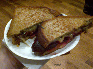 There was a tremendous amount of pork being served by Foodival vendors so it was not at all shocking when my husband opted to go this route for his big food splurge. A trio of sliders ($11) at Rashers included the Bacon Butty (British style bacon & homemade brown sauce), the Hogtown (peameal bacon, aged cheddar & homemade ale mustard) and the Wild Boar (cider glazed wild boar bacon, apple chutney, blue cheese & arugula). He was in pig heaven, which incidentally is not a happy place for actual pigs. The Hogtown slider was his favorite. Fortunately for me there were some solid non-pork options at the Jonny Blonde Food Truck and I tucked into The Butter Blonde ($9). Served on flatbread it contained tandoori chicken in Jonny's cashew butter chicken sauce, roasted cauliflower, melted brie and candied almonds. Oh. Man. If you ever get the opportunity to try this sandwich, DO IT. Spectacular.